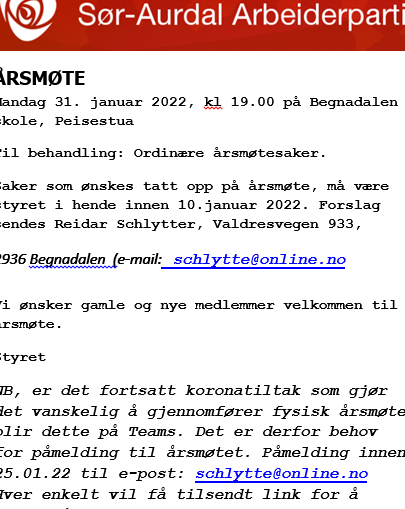 Godt nytt år til alle partivenner. Sør-Aurdal Arbeiderparti holder sitt årsmøte mandag 31. januar 2022 kl 19.00 på Begnadalen skole, Peisestua.